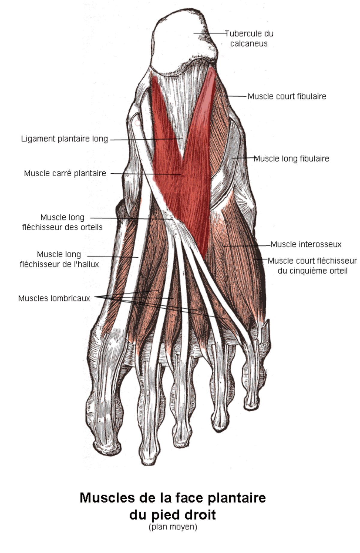 Insertion distale: il s'insère sur le bord postéro-externe du tendon du muscle long fléchisseur des orteils.