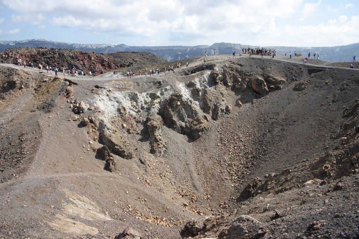 L'île qui culmine à 150 mètres d'altitude est couronnée par un cratère. Sortie de la mer en 1707, elle a fusionné avec l'îlot de Mikri Kaméni entre 1866 et 1870.