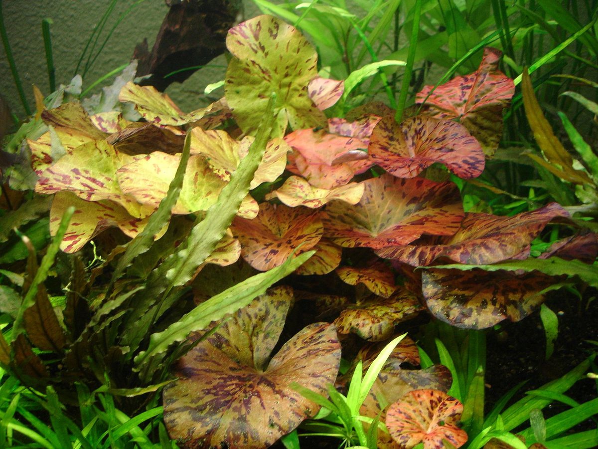 Sous l'eau les feuilles du Lotus tigré sont en fer de lance et peuvent avoir des nuances très variées, souvent striées de taches brunes, tandis que des feuilles flottantes sont plus rondes et moins colorées. Elles ont une couleur variant du vert tendre au marron rougeâtre.