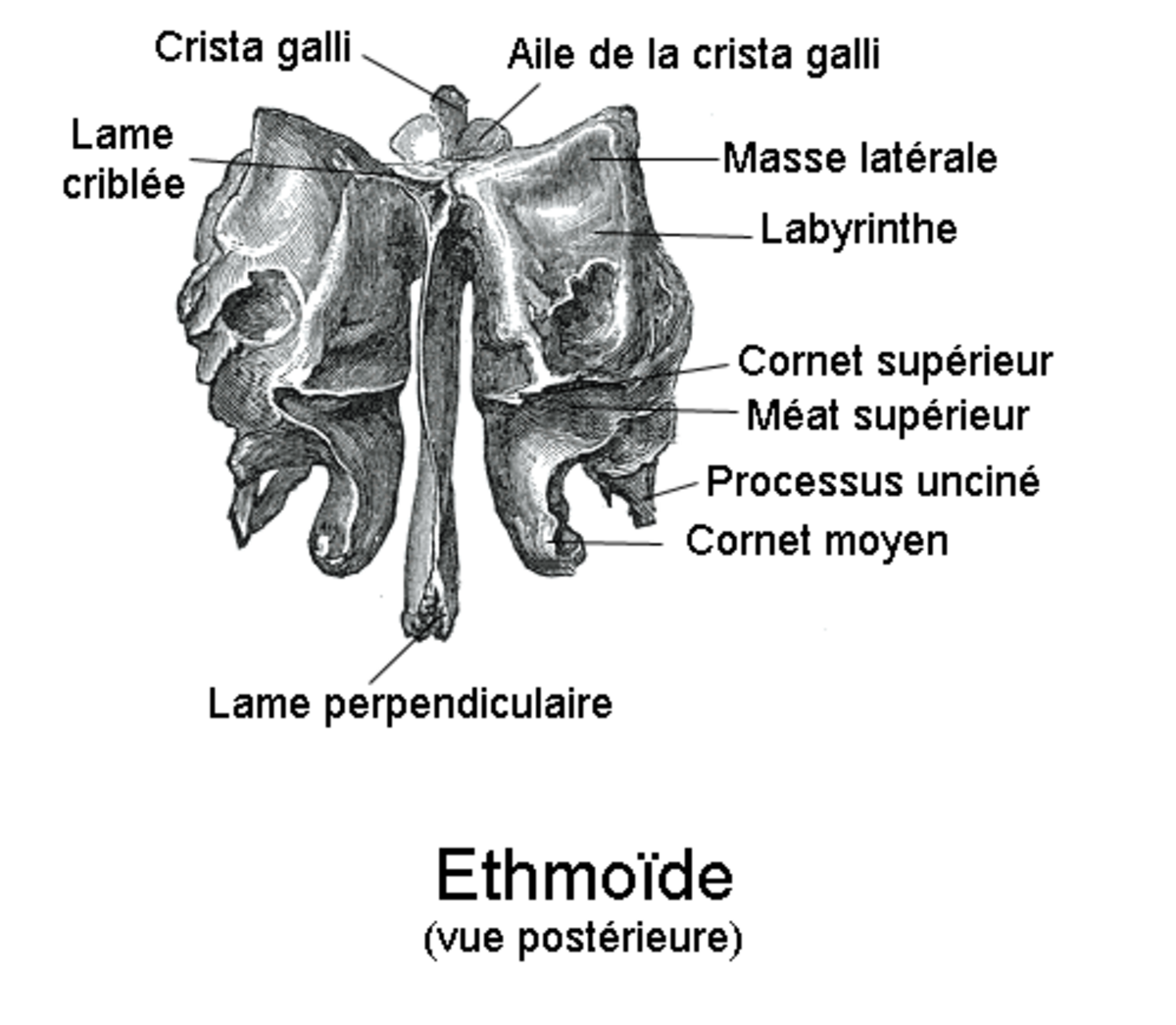 L’os ethmoïde (du grec ήθμοειδής, « pareil à un crible ») est un os médian de la base du crâne, il se trouve sous l’échancrure ethmoïdale de l’os frontal. Il appartient aussi à la paroi médiale de l’orbite et aux parois des fosses nasales. Il est composé de quatre parties : la lame verticale ou perpendiculaire, la lame criblée horizontale, deux masses latérales.