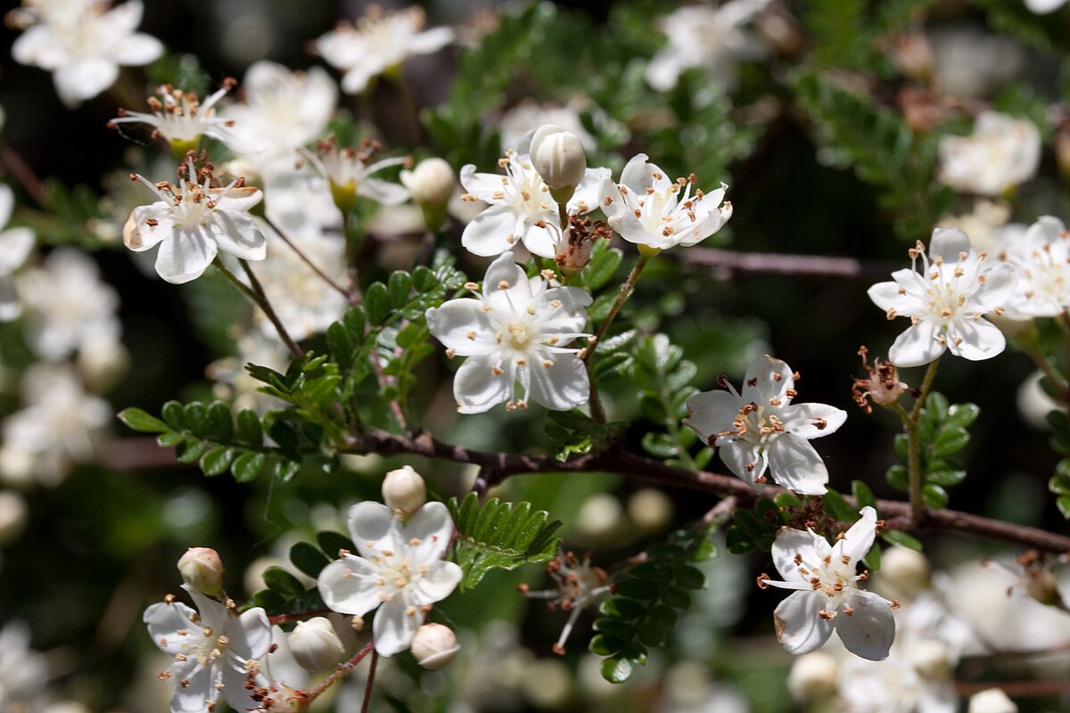 Des corymbes terminaux portent de nombreuses fleurs, à 5 sépales, 5 pétales et 20 étamines.