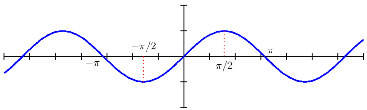 \begin{pspicture*}(-7.5,-3)(7.5,3) \psaxes[labels=none](0,0)(-7,-2)(7,2) \psplot[linecolor=blue, linewidth=1.5pt]{-7}{7}{x 0.01745329252 div sin} \uput[45](3.1415926,0){$\pi$} \uput[90](-1.570796,0){$-\pi/2$} \uput[-90](1.570796,0){$\pi/2$} \uput[-135](-3.1415926,0){$-\pi$} \psline[linewidth=1pt,linecolor=red,linestyle=dotted](1.57079632,1)(1.57079632,0) \psline[linewidth=1pt,linecolor=red,linestyle=dotted](-1.57079632,-1)(-1.57079632,0) \end{pspicture*} L'exemple précédent montre aussi que les commandes TeX peuvent être placées dans le bloc d'instructions d'une image.