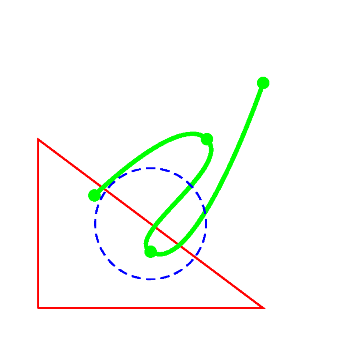 \begin{pspicture}(0,0)(6,6)%\psgrid[gridcolor=lightgray,gridlabels=0pt] \psline[linecolor=red](1,1)(5,1)(1,4)(1,1) \pscurve[linecolor=green,linewidth=2pt,showpoints=true](5,5)(3,2)(4,4)(2,3) \pscircle[linecolor=blue,linestyle=dashed](3,2.5){1} \end{pspicture} Les commandes de PSTricks sont très rudimentaires, ainsi beaucoup de fichiers d'extension LaTeX ont été réalisés afin de faciliter la création de toutes sortes de graphiques couramment utilisés dans la composition de textes mathématiques.