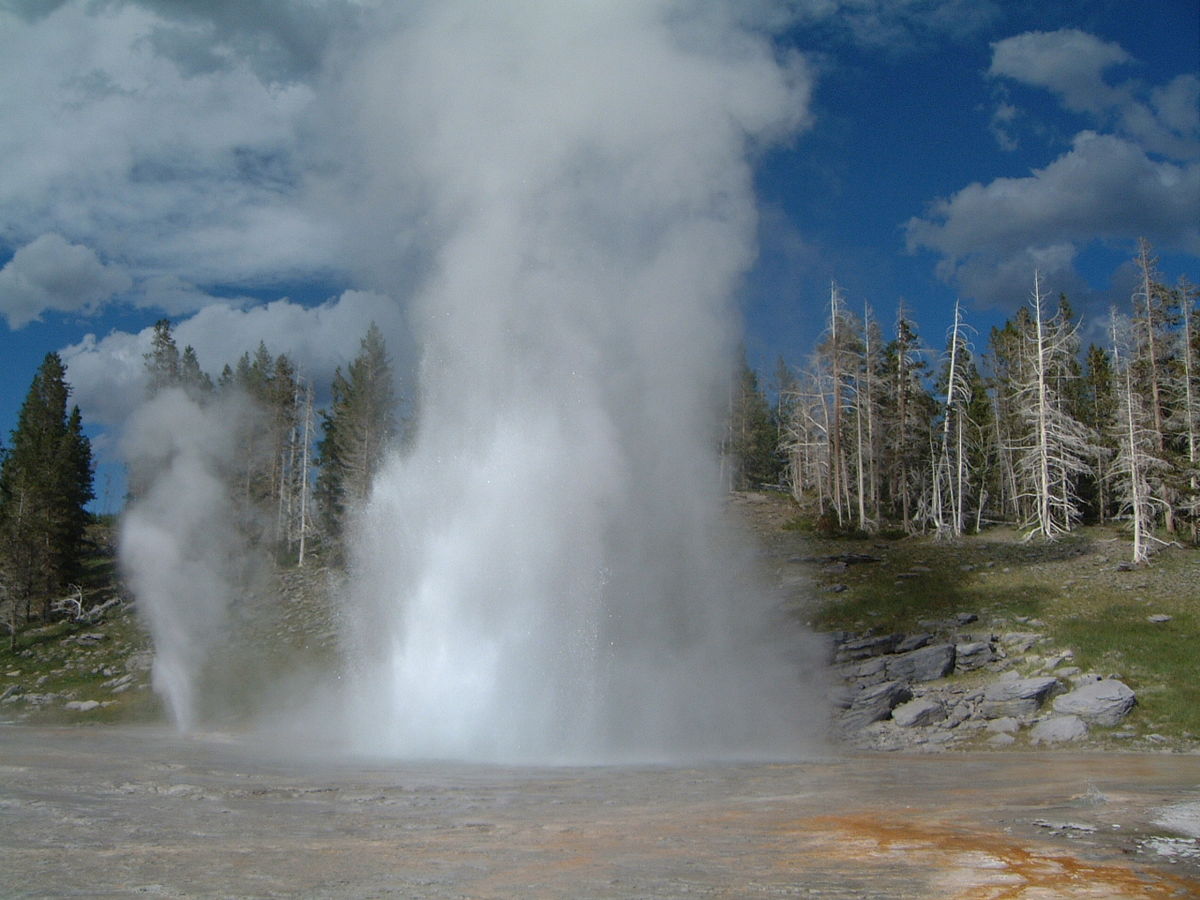 Les geysers sont des émanations d'eau surchauffée qui jaillissent généralement par intermittence. Lorsque des gaz remontent par la nappe phréatique surchauffée, elle exerce une pression sur le conduit extérieur qui empêche l'eau de la nappe de bouillir. Lorsque la pression est trop haute, l'eau jaillit brutalement par le conduit de la cheminée de l'édifice et crée une large colonne d'eau qui peut jaillir pendant plusieurs minutes.