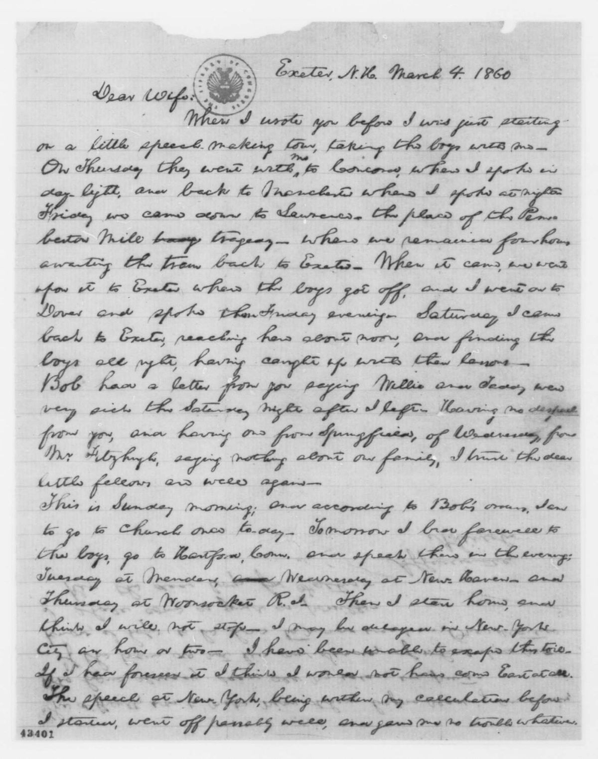 Lettre du Président Abraham Lincoln à sa femme Mary, écrite à Exeter où Lincoln rendait visite à son fils Robert, alors étudiant à la Phillips Exeter University. Mars 1860