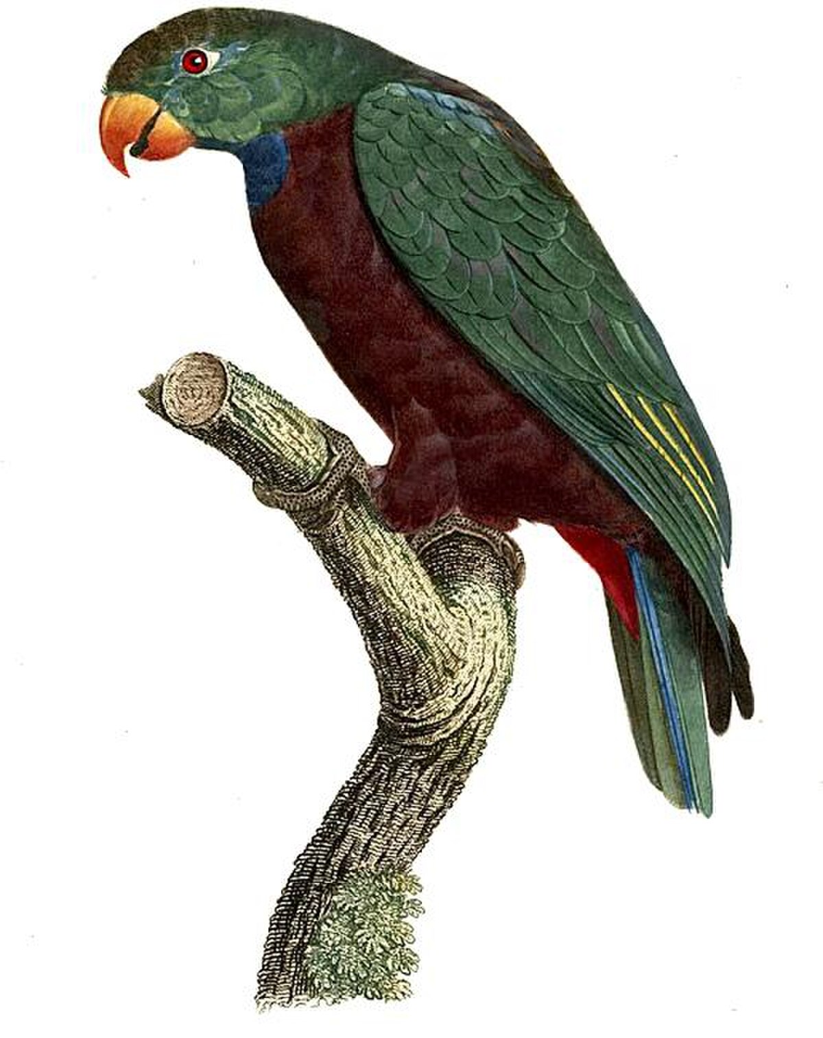 Oiseau dont la taille se situe entre 26 et 30 cm, de couleur générale vert-olive. Les plumes de la couronne et de l'arrière de la tête sont bordées de bleu sombre, extrémité des plumes des joues bleue, bande bleue à travers la gorge et le haut de la poitrine, poitrine et abdomen olive terne avec plumes plus ternes vers l'extrémité teintée de rose-bleuâtre, couvertures sous-caudales rouges, dos vert olive terne avec plumes marquées de brun-olive, rectrices internes vertes, rectrices externes bleues avec la base rouge, bec rouge avec base plus pâle, cercle oculaire gris, iris brun sombre, pattes grises.