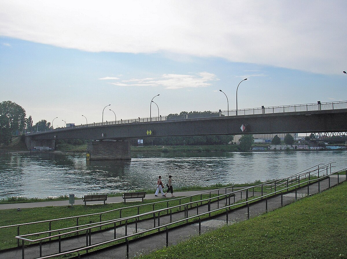 La construction d'un nouveau pont fut ouvert à la circulation le 12 juillet 1951. Ce fut un pont provisoire, car l'exécution à court terme d'un pont définitif devenait nécessaire en raison d'une incertitude concernant les conditions de résistance à la circulation qui n'était plus permise. L'ouvrage fut érigé sur les fondations de l'ancien pont routier. En guise de superstructure de soutien en acier pour deux voies et deux trottoirs, la partie Est du pont fut en treillis du type des chemins de fer allemands "Schaper-Krupp-Reichsbahnbrücke" à partir des piliers de soutien de 87,9 m et 59,1 m. Le côté ouest fut de construction française à partir de piliers de base de 58,1 m et 29,8 m.