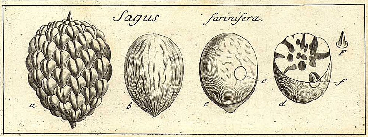 Le cœur de jeunes pousses peut être consommé. À partir de la moelle du stipe, avant la floraison particulièrement riche en amidon, est extrait le sagou, une farine alimentaire (Joseph Gaertner avait nommé l'espèce Sagus farinifera pour cette propriété).