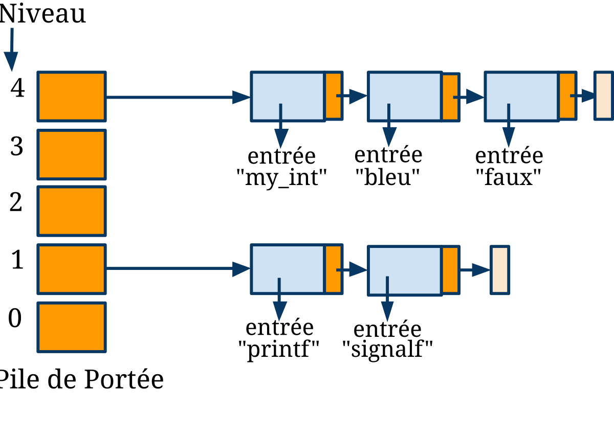 int i(){ int i; if(1){ int i; i = 2; } i=3; return (i); } Pour chaque bloc de programme (ayant des portées différentes) est associée une table de symboles. Chacune de ces tables est elles-même stockée dans une pile globale.
