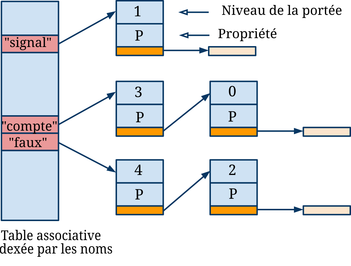 Une table associative centrale indexée par les noms des identificateurs. Chaque entrée pointe sur une pile de définitions, le sommet de chaque pile est la définition la plus récente.