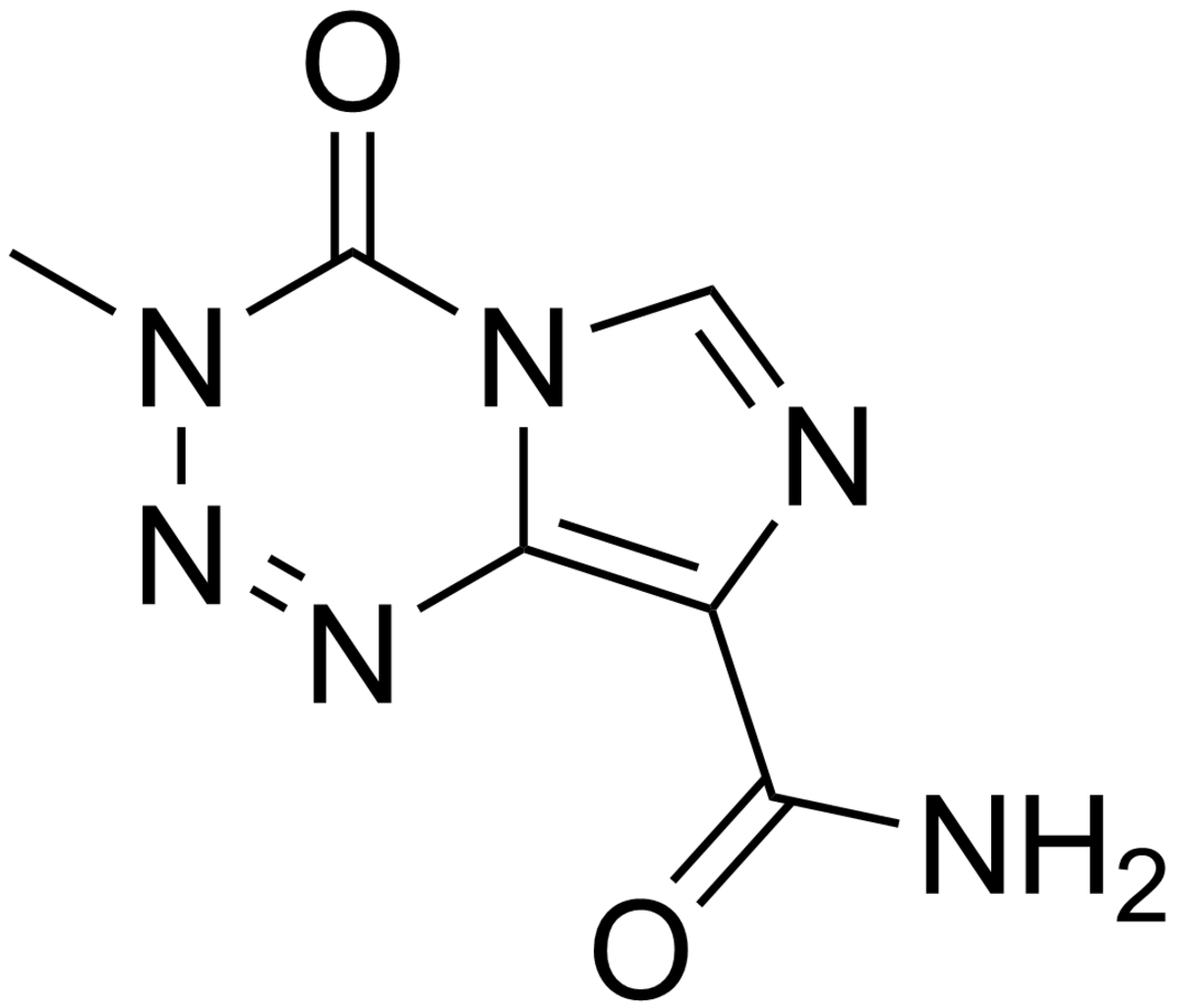 Le témozolomide subit une hydrolyse spontanée à pH physiologique en 3-méthyl-(triazén-1-yl)imidazole-4-carboxamide (MTIC) qui alkyle la guanine en position O⁶ et N⁷, les lésions cytotoxiques qui sont développées par la suite sont supposées entrainer une réparation aberrante de l'ADN.