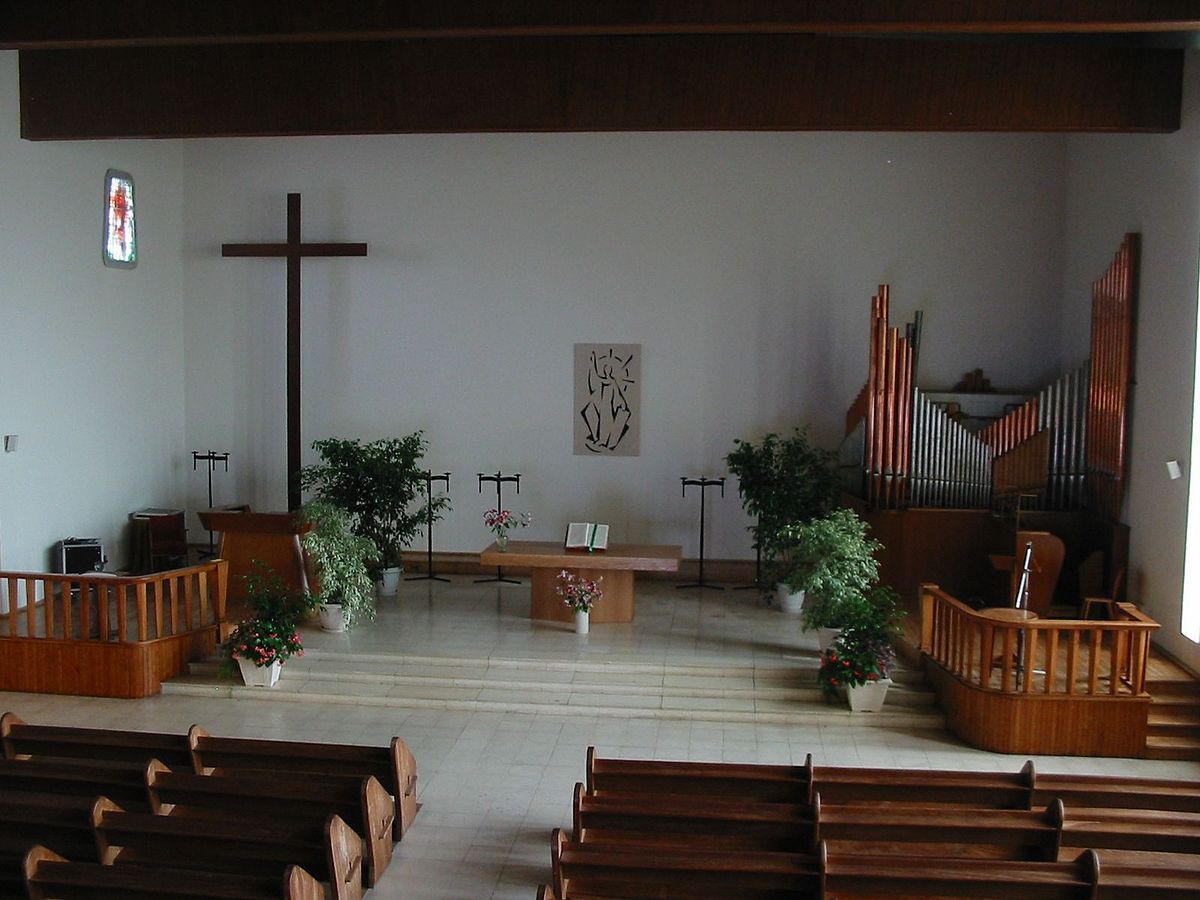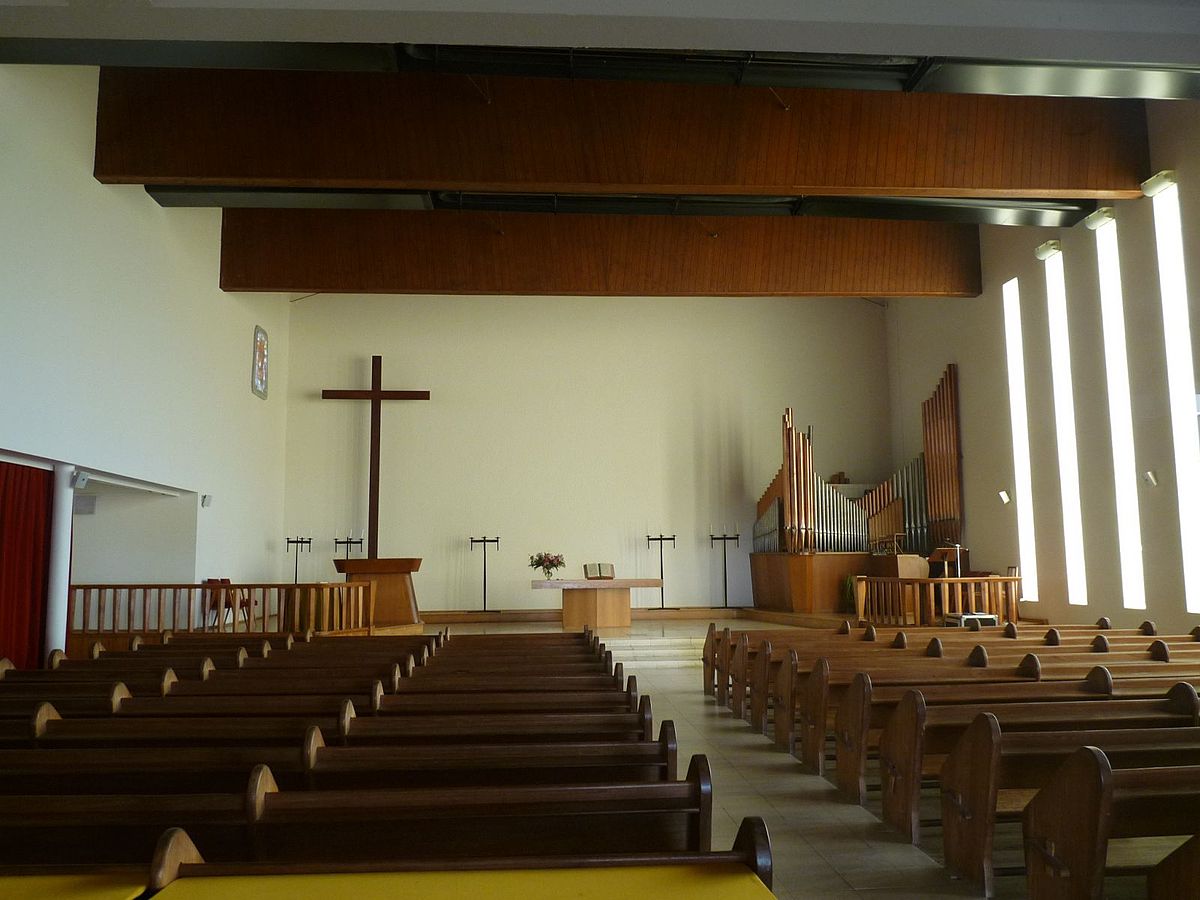 Le sanctuaire proprement dit est constitué d'un vaisseau de forme trapézoïdale éclairé par de grandes baies asymétriques et précédé par un narthex d'où l'on accède à une vaste tribune. La partie gauche du chœur accueille depuis 1962 un orgue construit par le facteur Schwendekel. Le centre protestant est inscrit au titre des monuments historiques depuis 2002.