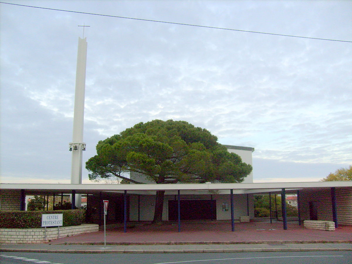 De par son esthétique moderniste et ses lignes épurées, le centre protestant participe au renouveau architectural du Royan d'après-guerre. Construit dans la rue d'Aunis de 1953 à 1957 sur les plans des architectes Marc Hébrard, René Baraton et Jean Bauhain, cet édifice mêlant béton armé, pierre et métal forme un complexe regroupant un sanctuaire dédié à la célébration du culte, plusieurs salles paroissiales, un logement de fonction pour le gardien et un presbytère, édifié un peu en retrait. Les bâtiments s'inspirent de l'église Saint-François d'Assise de Pampulha, au Brésil. Les éléments architecturaux s'ordonnent autour d'un parvis délimité par un portique d'où surgit un campanile effilé. Haut de 18 mètres, celui-ci s'élance vers le ciel à travers une trémie ménagée dans le toit-terrasse.