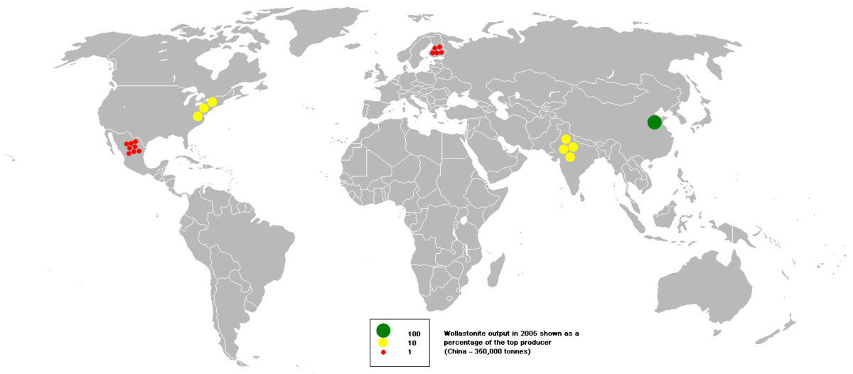 En 2005, la Chine était le premier producteur mondial de wollastonite avec au moins 50 % de parts de marché, suivie par l'Inde et les États-Unis, suivant le rapport du « British Geological Survey ». Aux États-Unis, la wollastonite est exploitée à Willsboro, État de New York. Les dépôts ont également été exploités commercialement dans le nordouest du Mexique (Schéma 3).